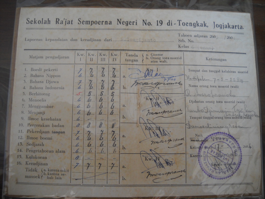 Raport Jaman Jepang, sekolah rakyat di Jogjakarta, tahunnya masih memakai tahun Jepang 2603/2604. Kondisi masih bagus, (SOLD)